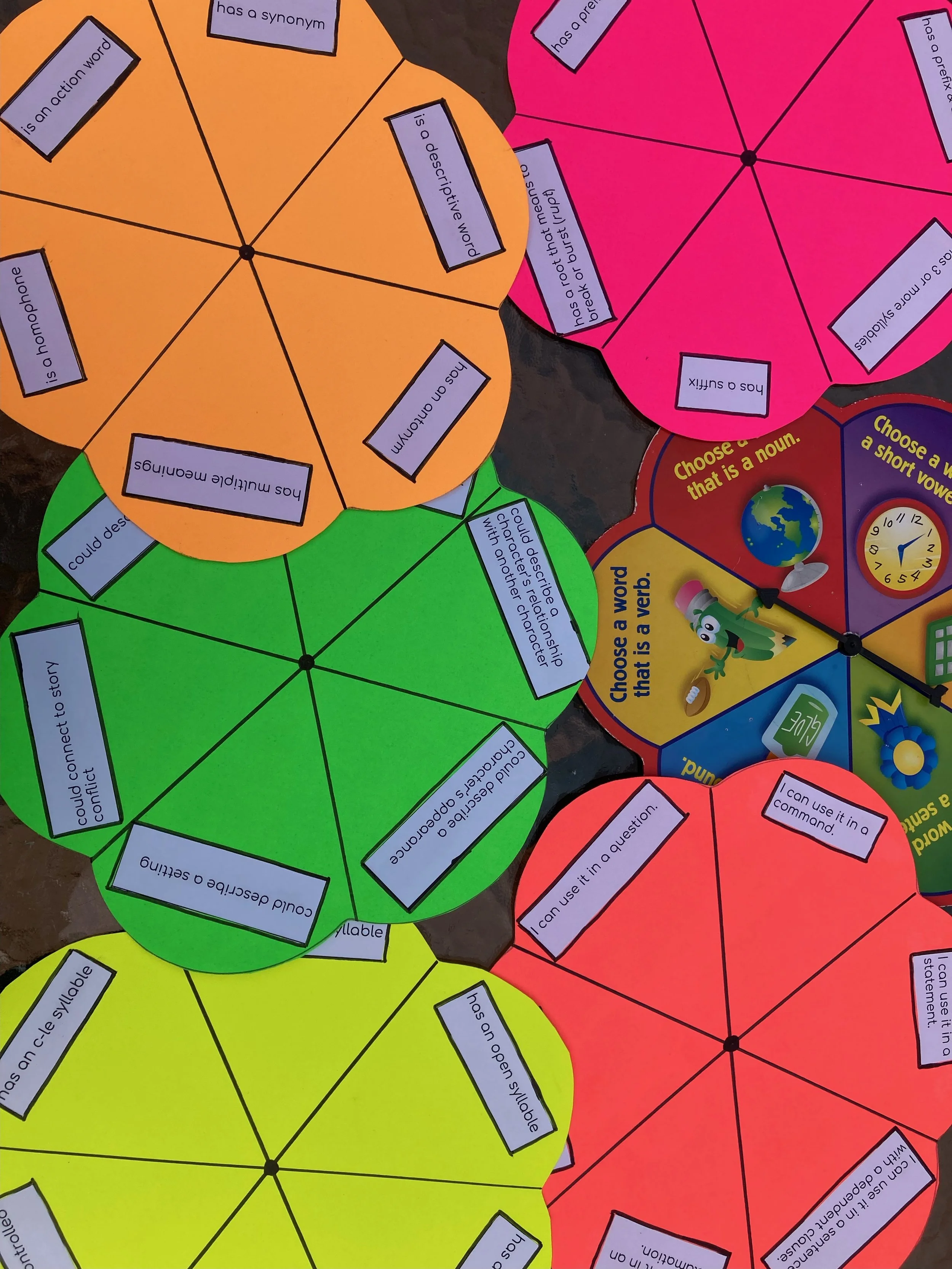 You can purchase vocabulary wheels at Really Good Stuff, Oriental Trading, even Temu. Some are magnetic and others have suction cups. Children can also make their own wheel with a pencil and large paper clip.